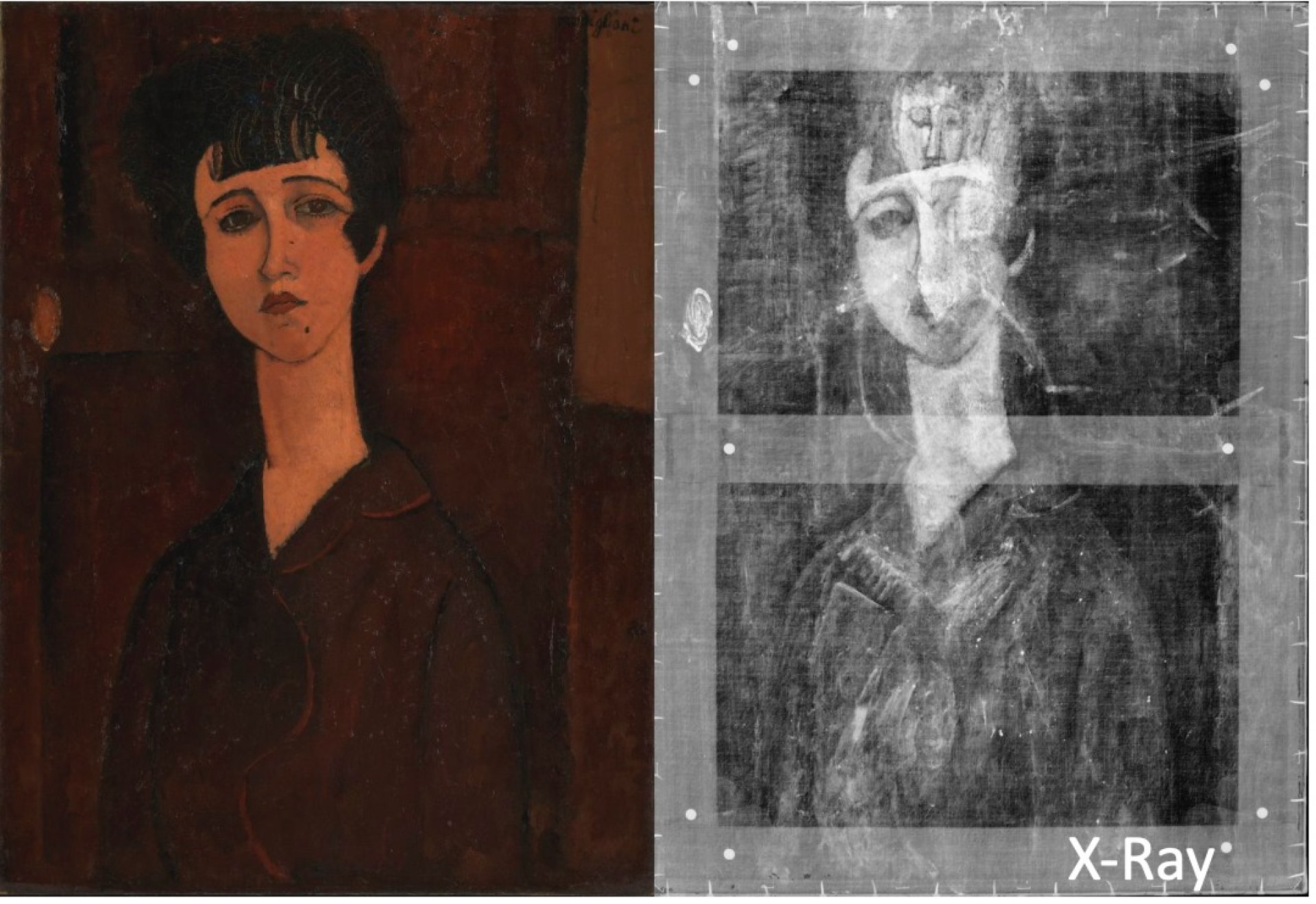 อย่างเช่นงานชิ้นนี้ที่มีการค้นพบว่าศิลปินวาดภาพหญิงสาวคนหนึ่งทับบนภาพของหญิงสาวอีกคน การศึกษาด้วยรังสีเอกซ์ของคณะทีมวิจัยของพิพิธภัณฑ์ Tate Modern เผยให้เห็นว่าภายใต้ภาพเหมือนของหญิงสาว (portrait of a girl) ซึ่งเป็นงานชิ้นมาสเตอร์พีชที่มีชื่อเสียงของ อาเมเดโอ โมดีกลีเอนี (Amedeo Modigliani) ศิลปินชาวอิตาลีผู้ใช้ชีวิตการทำงานในฝรั่งเศสในช่วงปลายคริสต์ศตวรรษที่ 19 ถึงต้นคริสต์ศตวรรษที่ 20 ได้ซ่อนภาพเหมือนของหญิงสาวอีกภาพหนึ่งไว้ และความจริงนั้นก็ไม่ได้ถูกเปิดเผยจนเวลาผ่านไปราวหนึ่งร้อยปี